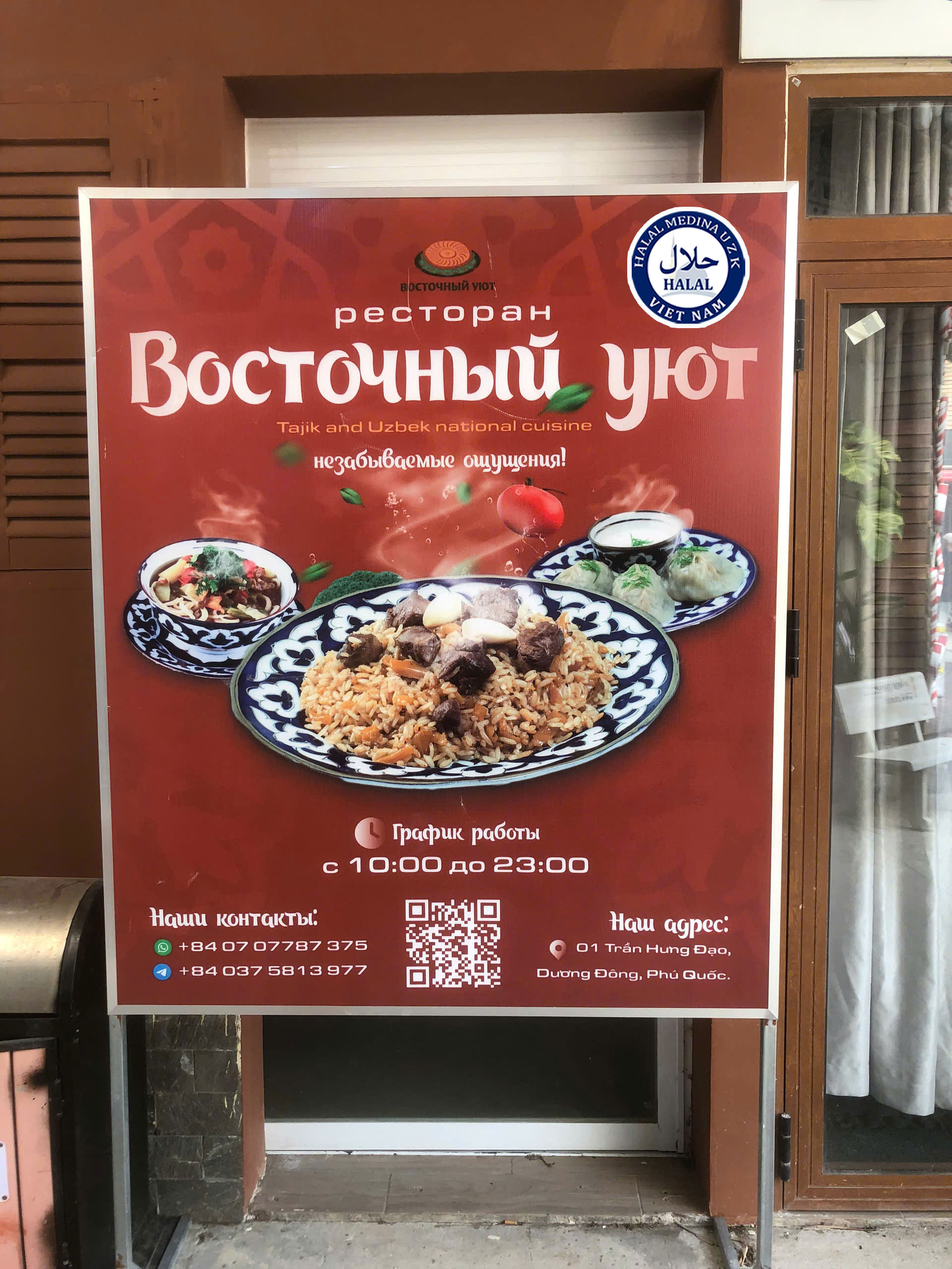 Nhà hàng Восточный уют (Tiện nghi Phương Đông) – mang đậm phong cách ẩm thực Tajikistan và Uzbekistan, tọa lạc tại số 01 Trần Hưng Đạo, phường Dương Đông, đặc khu Phú Quốc, đã chính thức đạt chứng nhận Halal do Văn phòng Chứng nhận Halal Medina UZK cấp. Đây là minh chứng quan trọng khẳng định nhà hàng đáp ứng đầy đủ các tiêu chuẩn Halal nghiêm ngặt, phù hợp phục vụ cộng đồng người Hồi giáo và du khách quốc tế.